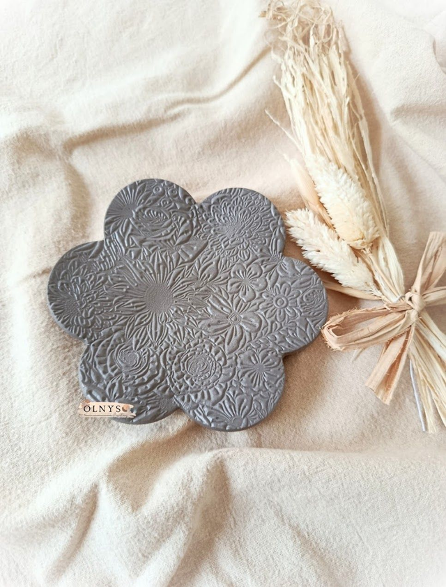 Coupelle porte bijoux en argile couleur terracotta ou grise, motif floral en relief, pour déposer d'une jolie manière vos bijoux lorsque vous ne les portez pas ou bien encore vos clés par exemple.