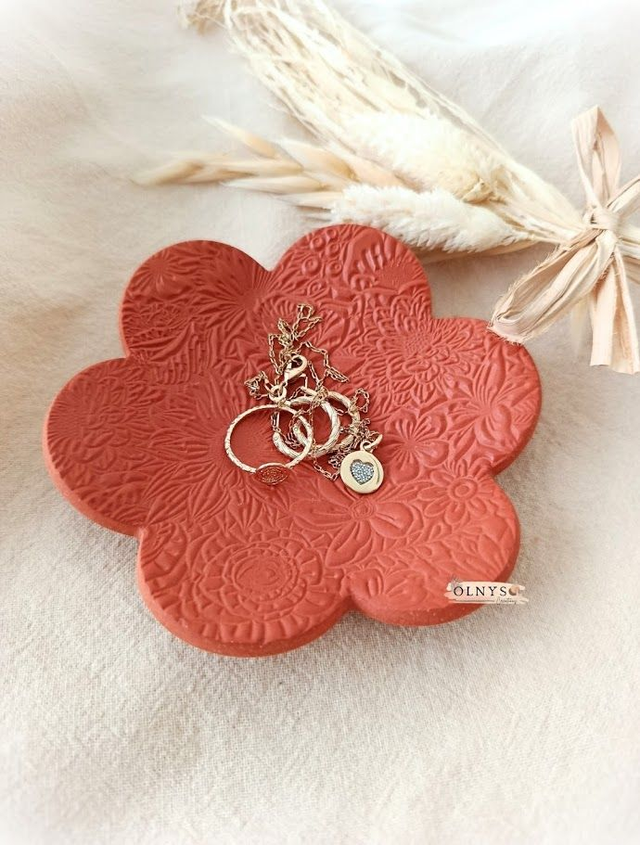Coupelle porte bijoux en argile couleur terracotta motif floral en relief / Vide-poche