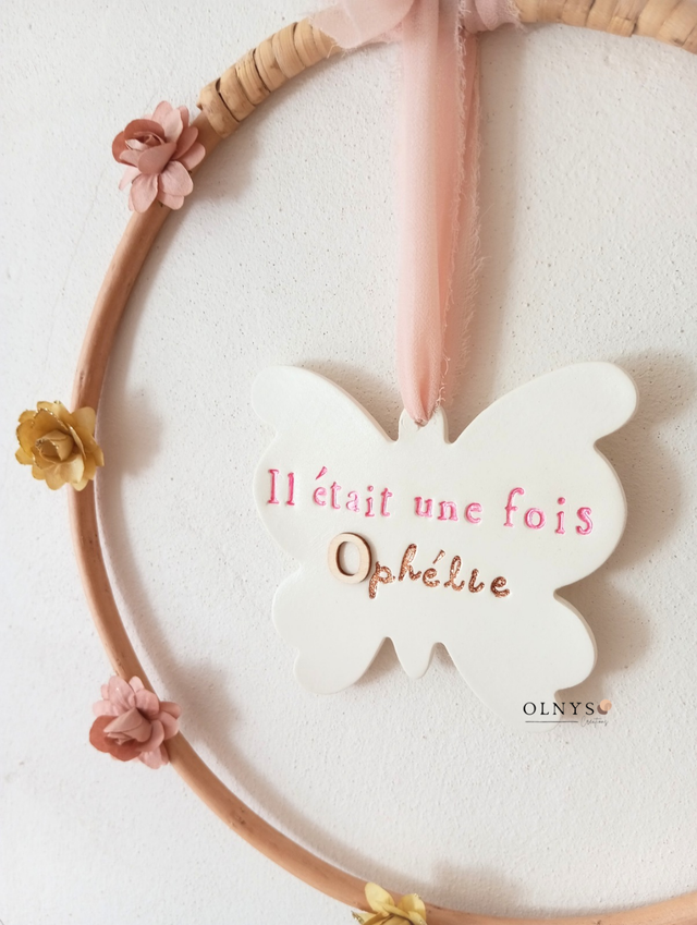 Couronne en osier (diam 25 cm) avec suspension en argile (texte personnalisable) agrémentée de petites fleurs en papier et ruban en mousseline.