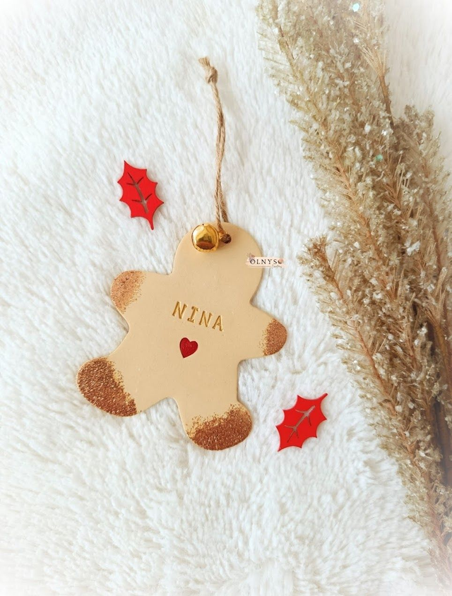 Suspension en argile en forme de bonhomme en pain d'épice avec prénom personnalisable peint en couleur or + petit coeur rouge.