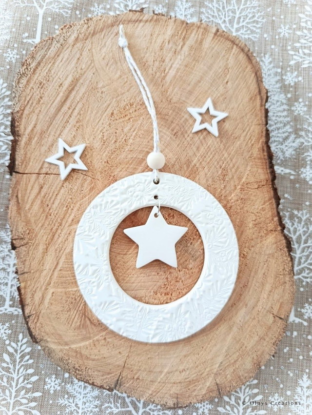 Décoration de Noël en argile de forme ronde avec relief motif houx + petite étoile suspendue.